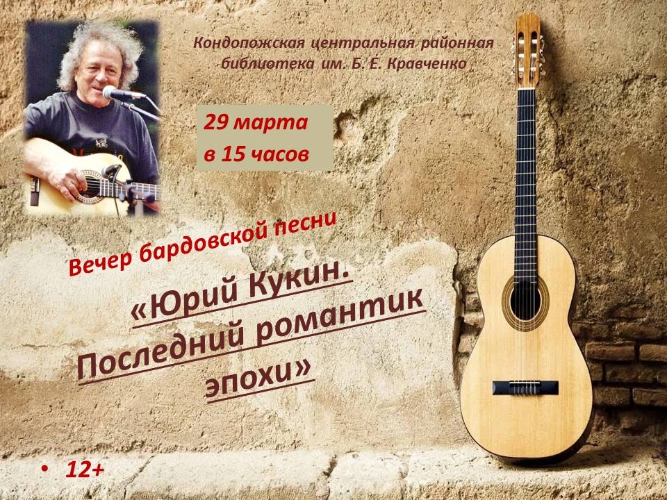 Дорогие друзья! А не поехать ли нам за туманом, за мечтами и за запахом тайги? Всех любителей авторской песни приглашаем 29 марта в 15 часов на вечер, посвященный творчеству Юрия Кукина. Его творчество - это поэзия далёких гор, чистого неба и увлечённых людей. Кукина называют последним романтиком,чьи песни, такие как "За туманом", стали гимном для нескольких поколений.