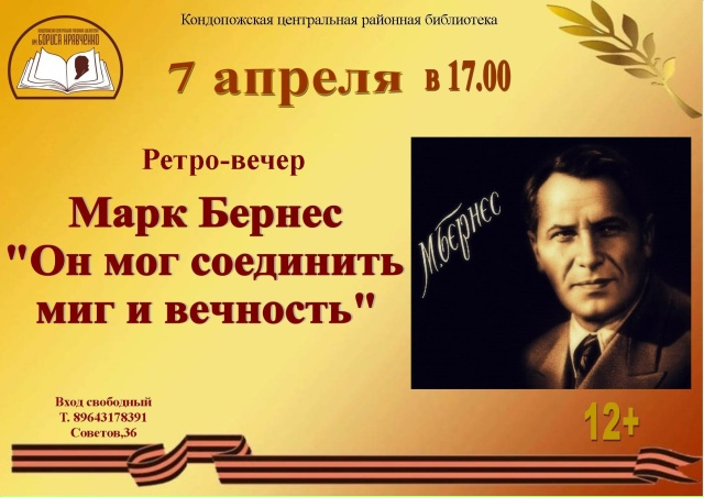 Марк Бернес. Народный артист РСФСР (1965). Лауреат Сталинской премии первой степени (1951). Один из наиболее любимых артистов советской эстрады 1950-х — 1960-х годов, выдающийся русский шансонье. Во многом благодаря Бернесу сложился золотой фонд советской песенной классики. 7 апреля в 17.00. Вход свободный 6+