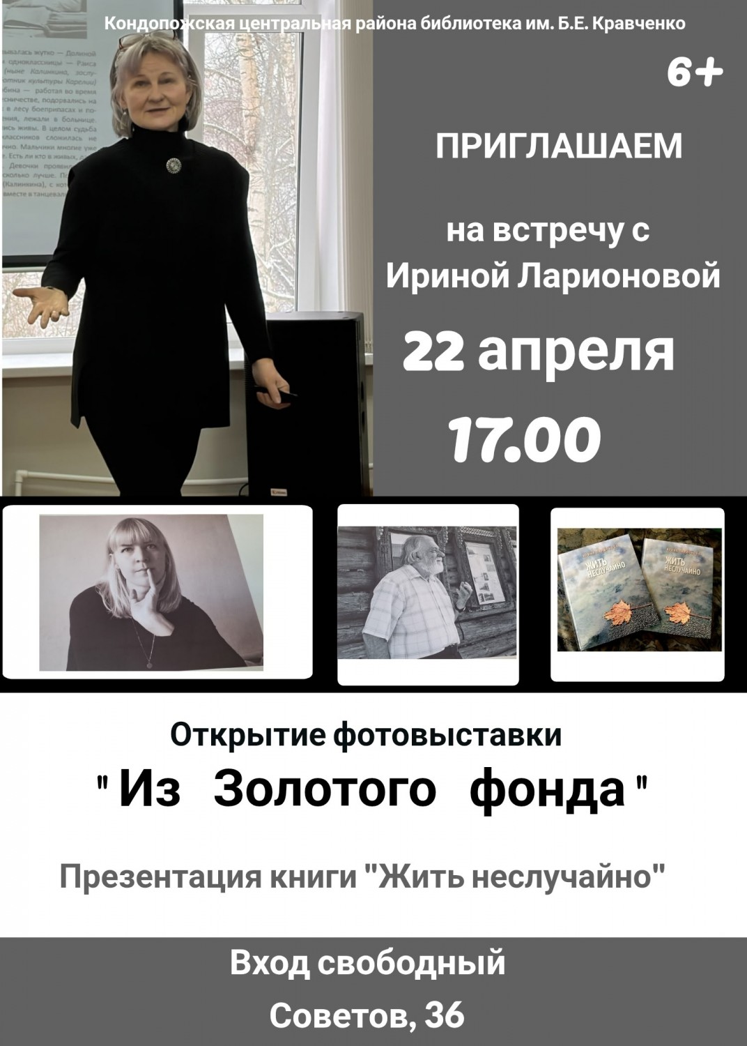 22 апреля в 17.00 приглашаем на открытие фотовыставки "Из золотого фонда" и презентацию книги "Жить неслучайно". Автор - фотограф, журналист, заслуженный работник культуры Карелии Ирина Ларионова
