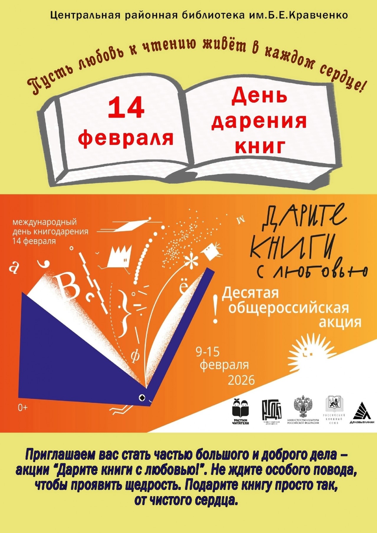 Напоминаем о возможности принять участие в ежегодной акции "Дарите книги с любовью!", которая проходит с 9 по 15 февраля. Приглашаем Вас стать частью большого и доброго дела. Будем очень рады подаренным книгам. Ваше участие бесценно!