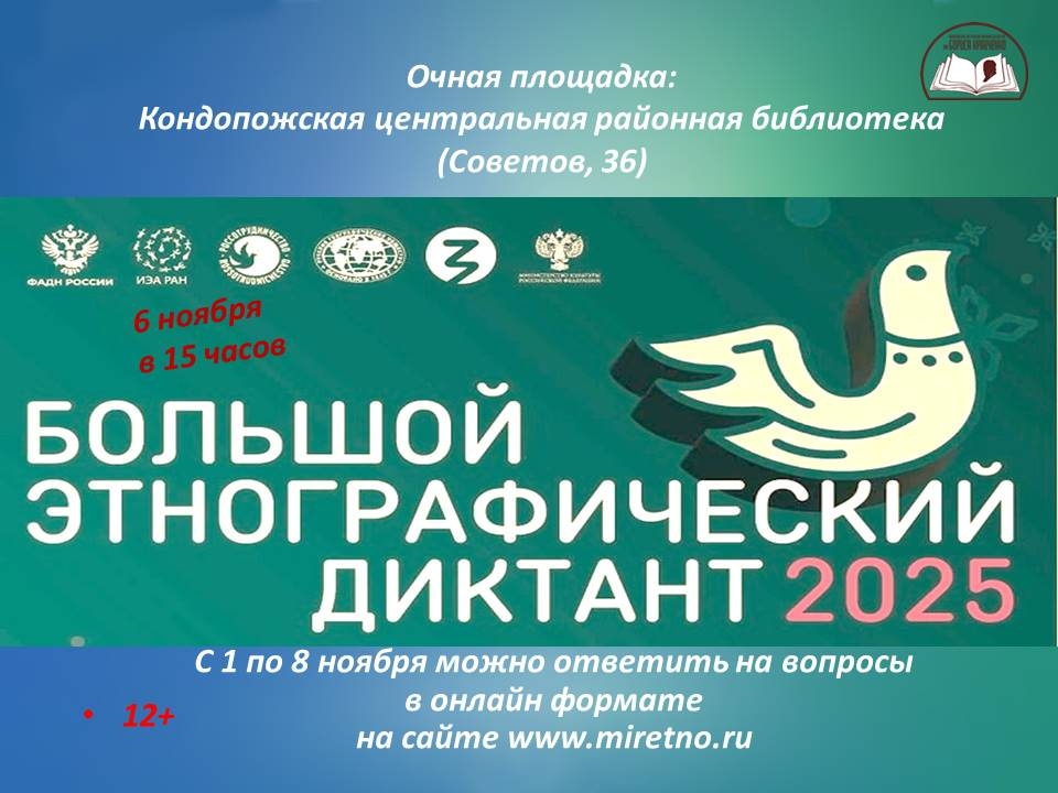 Диктант можно будет написать на очной площадке в нашей библиотеке 6 ноября в 15 часов или онлайн с 1 по 8 ноября на официальном сайте Большого этнографического диктанта miretno.ru.