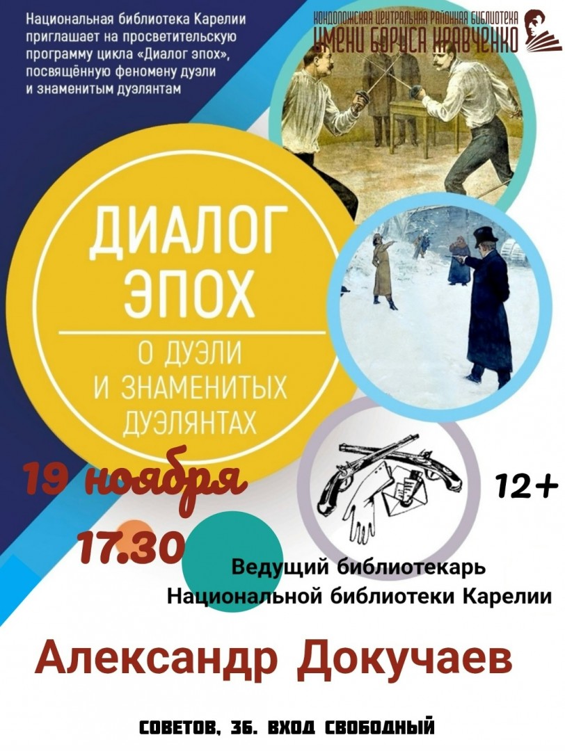 Дорогие друзья! Совсем скоро стартует наш фестиваль "Время читать!" 19 ноября к нам в гости приедет ведущий библиотекарь Национальной библиотеки РК Александр Докучаев с интересным мероприятием "О дуэли и знаменитых дуэлянтах". Не пропустите эту встречу!