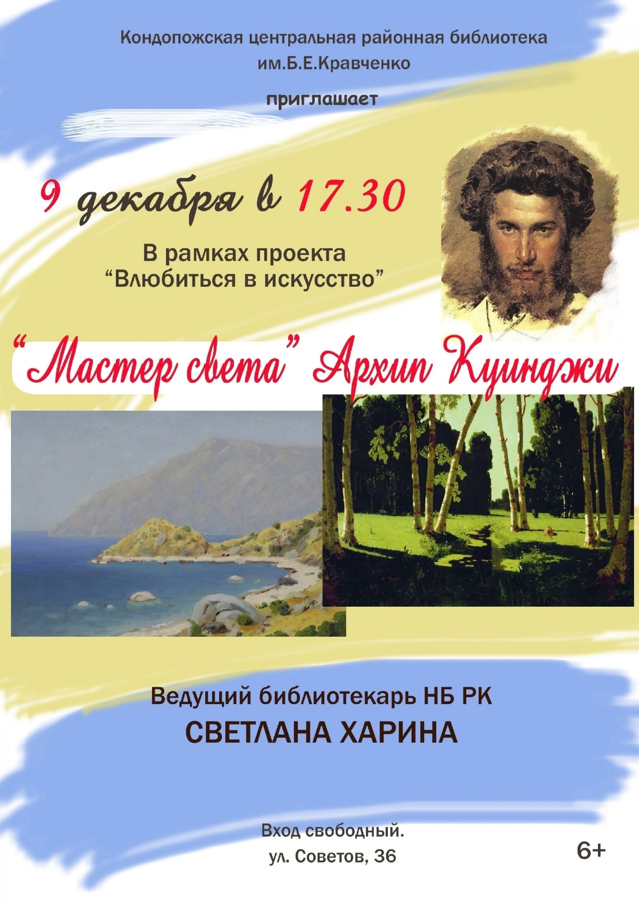 9 декабря в 17.30, в рамках проекта "Влюбиться в искусство" состоится мероприятие "Мастер света" Архип Куинджи, посвященное великому художнику. Встречу ведет главный библиотекарь Национальной библиотеки РК Светлана Харина